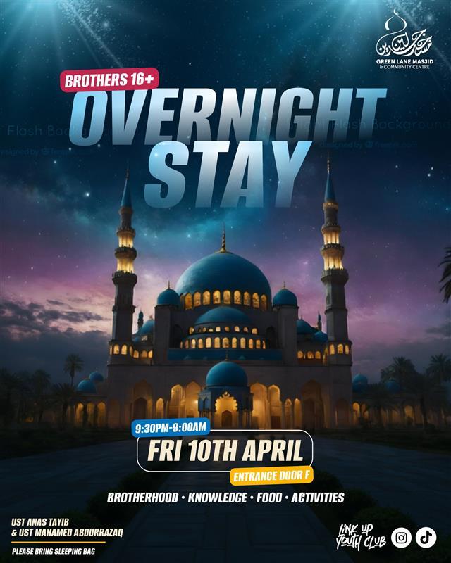 Join us for a special overnight experience designed for brothers to connect, reflect, and grow in a positive Islamic environment. The night will include a range of engaging activities alongside beneficial reminders to strengthen faith and character.