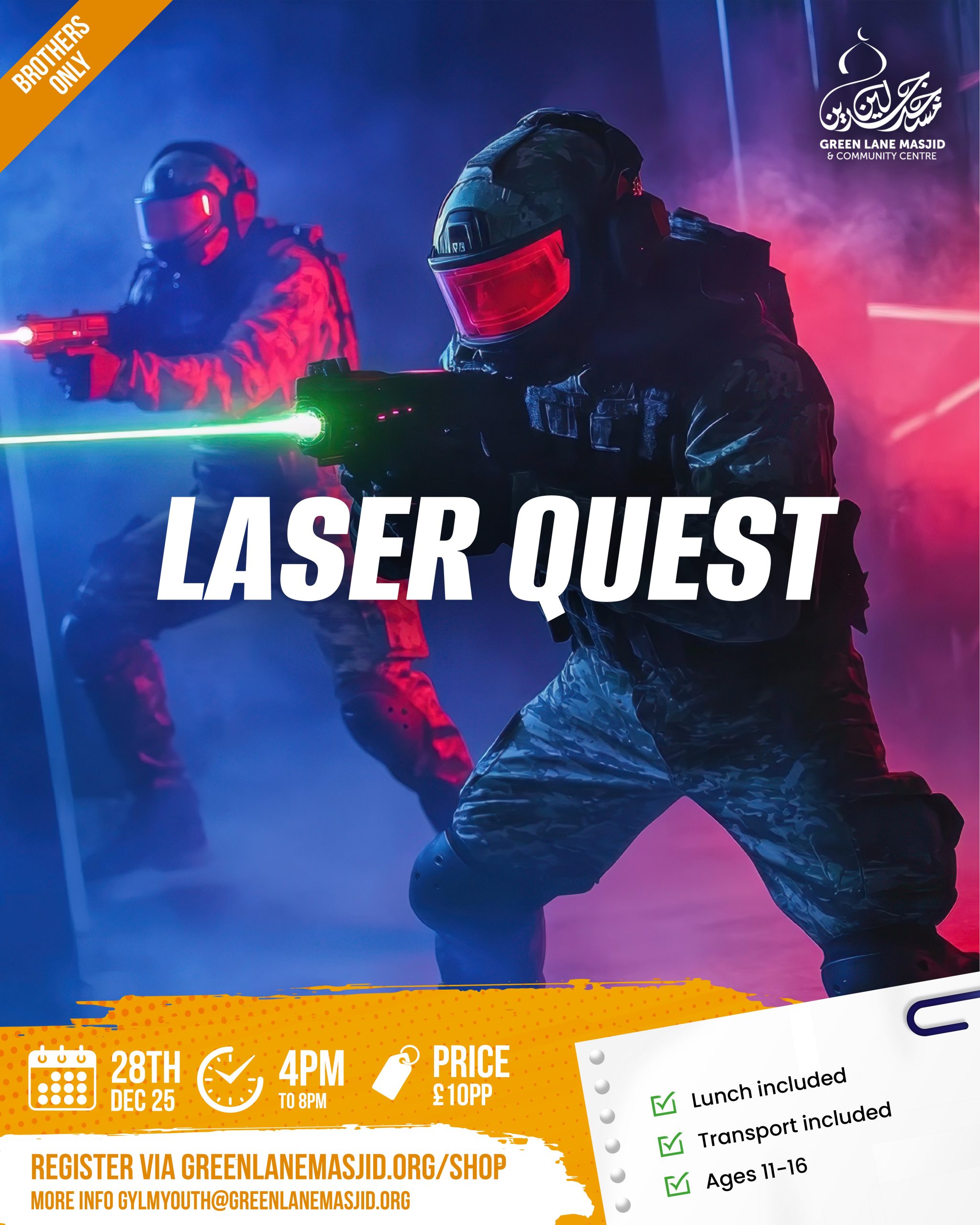Join us for an immersive Laser Quest experience where participants will compete in fast-paced missions using high-tech laser gear. This event promotes teamwork, physical activity, and a fun environment for boys to unwind and socialise under the supervision of Link Up Youth mentors.